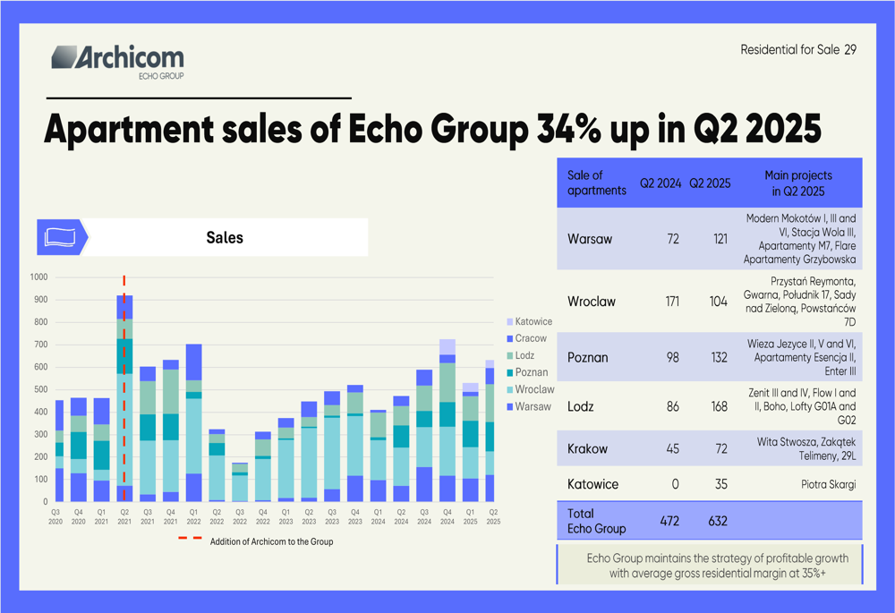 The company maintains a strong landbank of more than 12,600 units, with almost 3,000 units in offer and 800 in pre-sale. Echo Group is active in six major Polish markets, with projects under construction and land secured in Warsaw, Wrocław, Kraków, Łódź, Poznań, and Tricity.