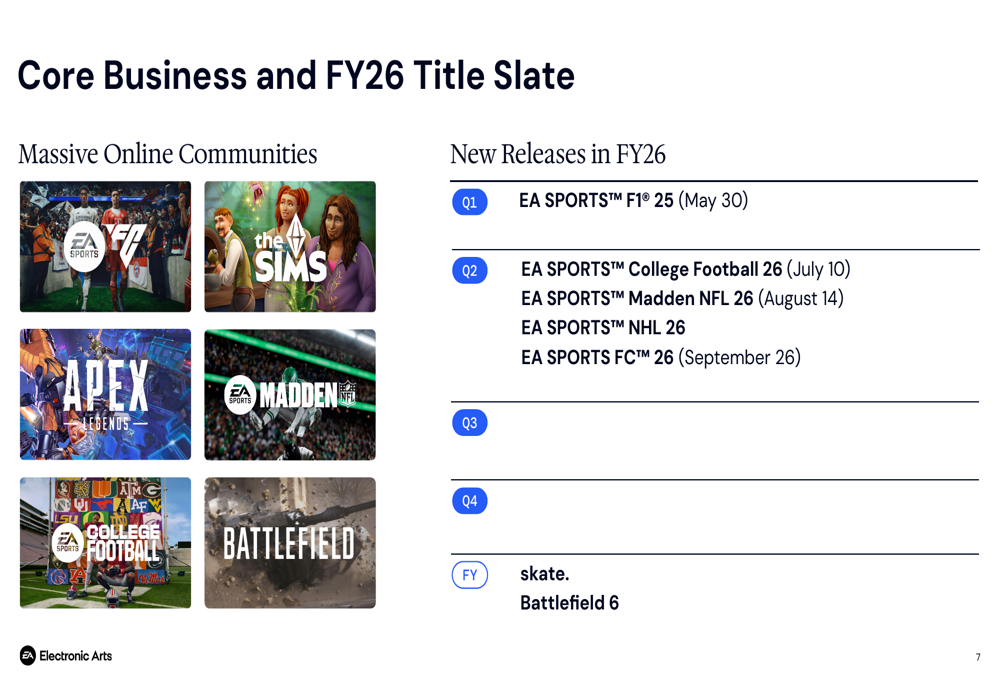 Key Q2 releases include EA SPORTS College Football 26 (July 10), EA SPORTS Madden NFL 26 (August 14), EA SPORTS NHL 26, and EA SPORTS FC 26 (September 26). Looking further ahead, the company plans to release skate. and Battlefield 6 later in the fiscal year.