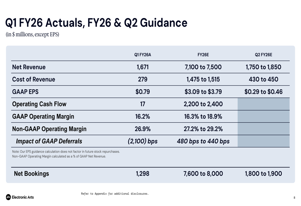 EA delivered $1.3 billion in net bookings for Q1 FY26, representing a 3% increase compared to the same period last year. The company reported GAAP earnings per share of $0.79 and operating cash flow of $17 million, significantly down from $120 million in Q1 FY25.