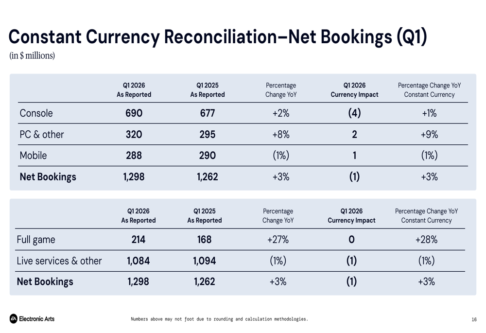 When adjusting for currency effects, EA’s net bookings growth rate remained at 3% year-over-year for Q1 FY26. Full game bookings showed particularly strong performance at 28% growth on a constant currency basis.