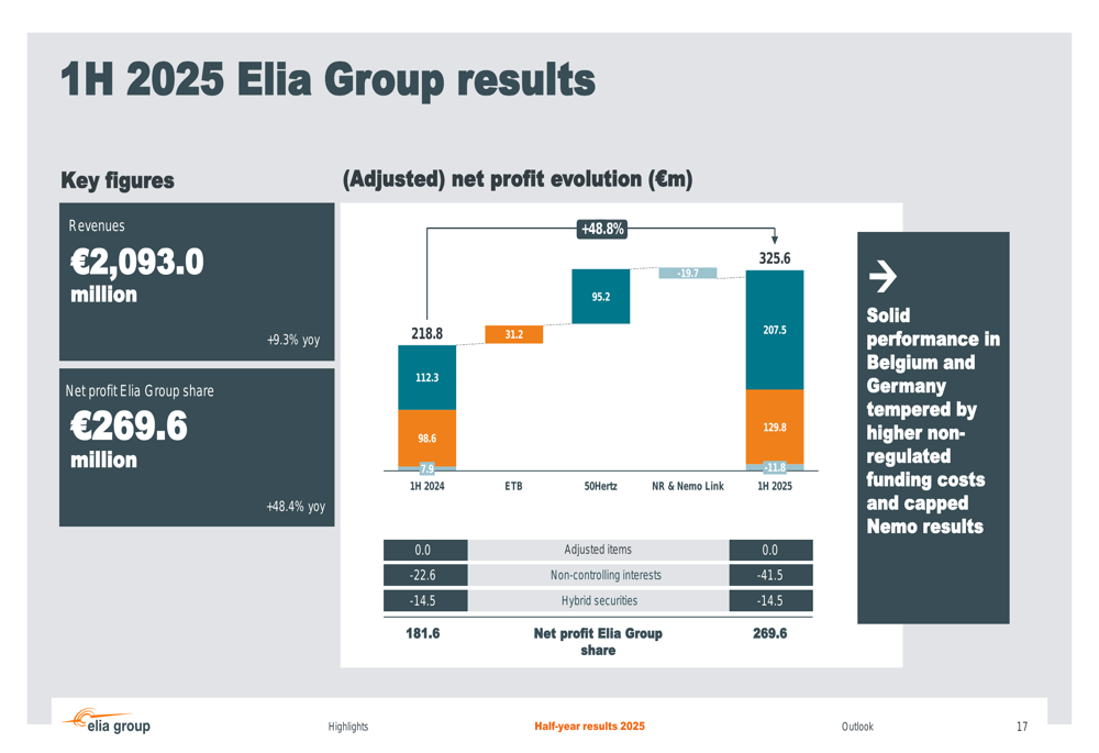 Elia Group reported a substantial 48.4% year-over-year increase in net profit to €269.6 million for the first half of 2025, driven by strong performance in both its Belgian and German operations. Group revenues reached €2,093.0 million, representing a 9.3% increase compared to the same period last year.