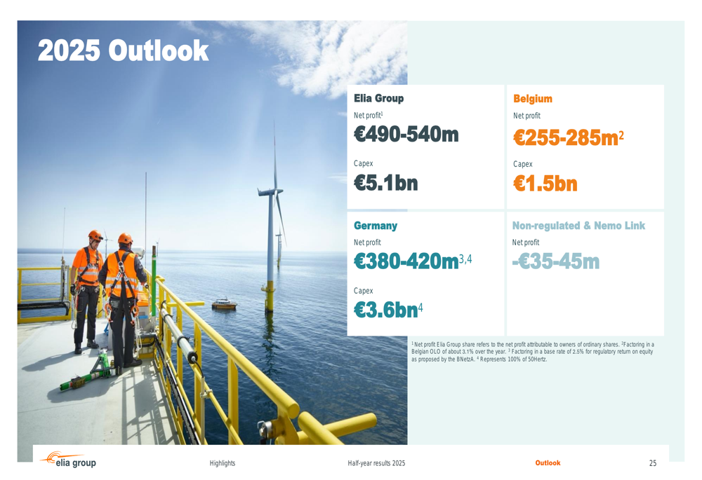 For the full year 2025, Elia Group has provided a positive outlook with projected net profit between €490-540 million. The company plans significant capital expenditures totaling €5.1 billion, with €3.6 billion allocated to Germany and €1.5 billion to Belgium.