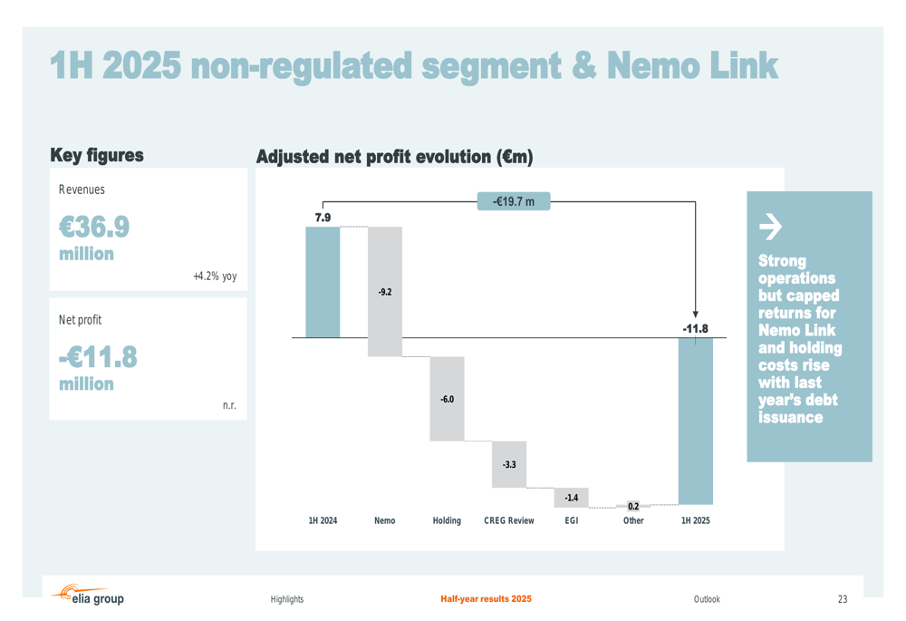The Non-Regulated segment and Nemo Link (the interconnector between Belgium and the UK) reported a net loss of €11.8 million. Despite strong operational performance, returns from Nemo Link were capped, and holding costs increased due to last year's debt issuance.