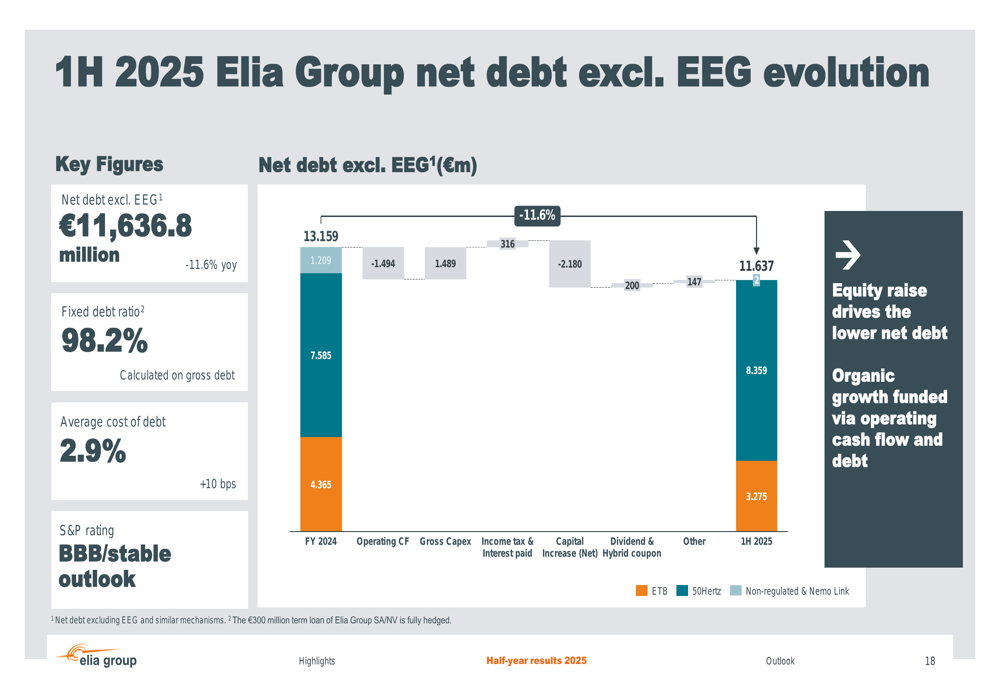 Elia Group's strong performance was reflected across its business segments, with both its Belgian (ETB) and German (50Hertz) operations showing substantial growth. The company's net debt excluding EEG mechanisms decreased by 11.6% year-over-year to €11,636.8 million, while maintaining a solid fixed debt ratio of 98.2% and an average cost of debt of 2.9%.