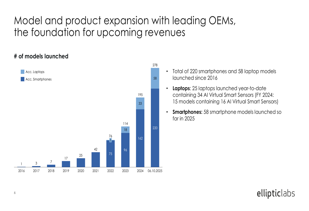 The company's leading market position allows for rapid adoption without proof-of-concept testing, and partnerships with chipset providers Qualcomm and MediaTek facilitate market expansion. Notably, three of the top five global smartphone OEMs are now Elliptic Labs customers.