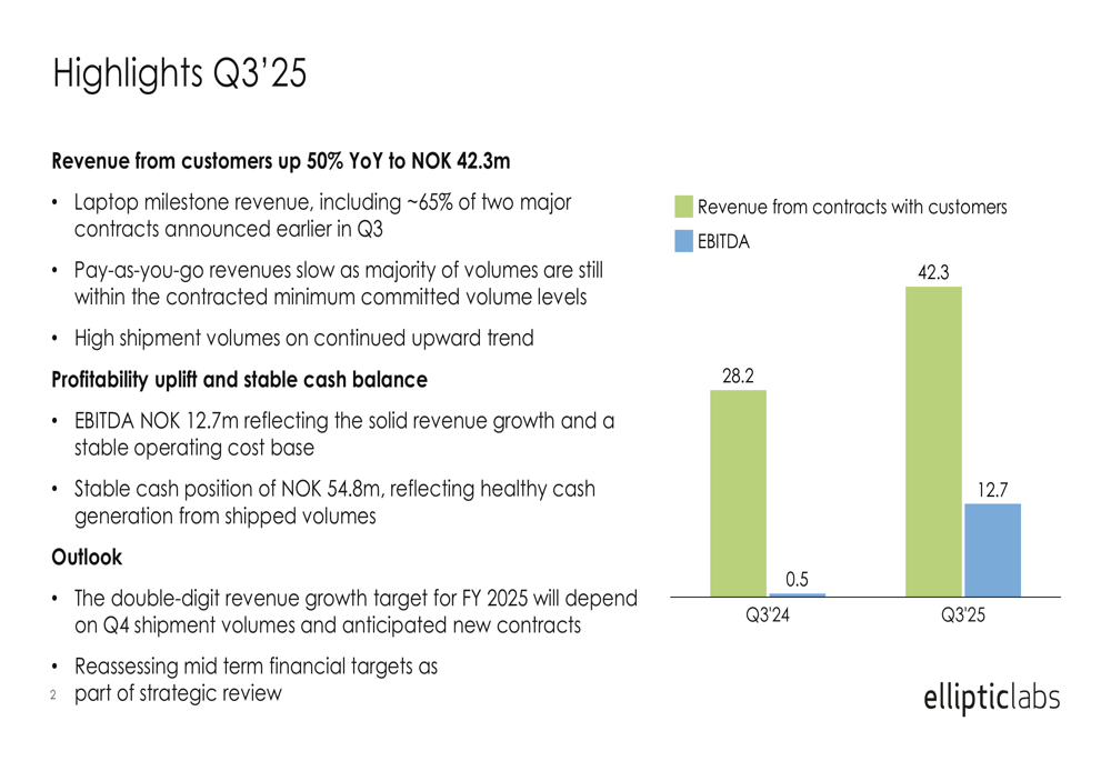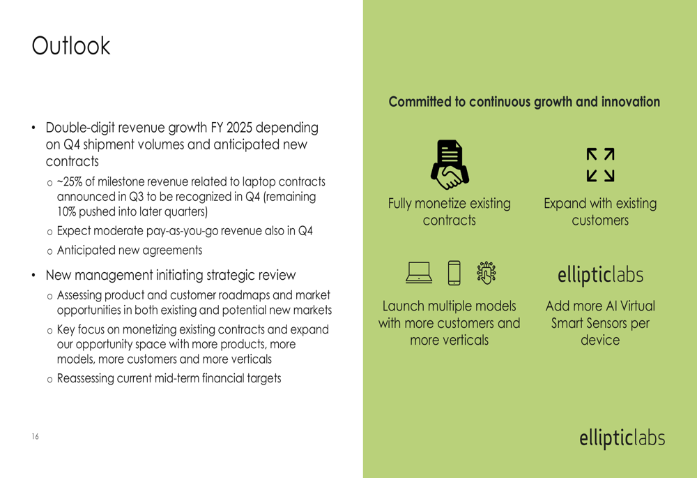 Elliptic Labs is targeting double-digit revenue growth for the full year 2025, though management noted this depends on Q4 shipment volumes and new contracts. The company is currently conducting a strategic review to assess product and customer roadmaps and market opportunities.