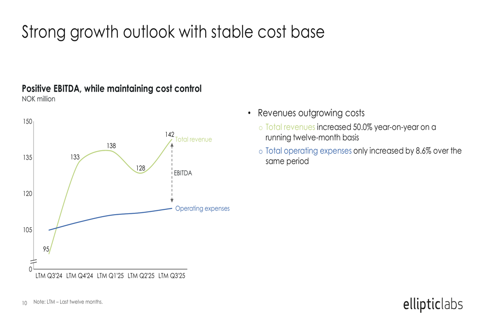 A key strength in Elliptic Labs' financial performance is its ability to grow revenue significantly while maintaining tight cost control. Total operating expenses increased by only 8.6% year-over-year, compared to the 50% revenue growth over the same period. This operational leverage has enabled the substantial improvement in EBITDA.