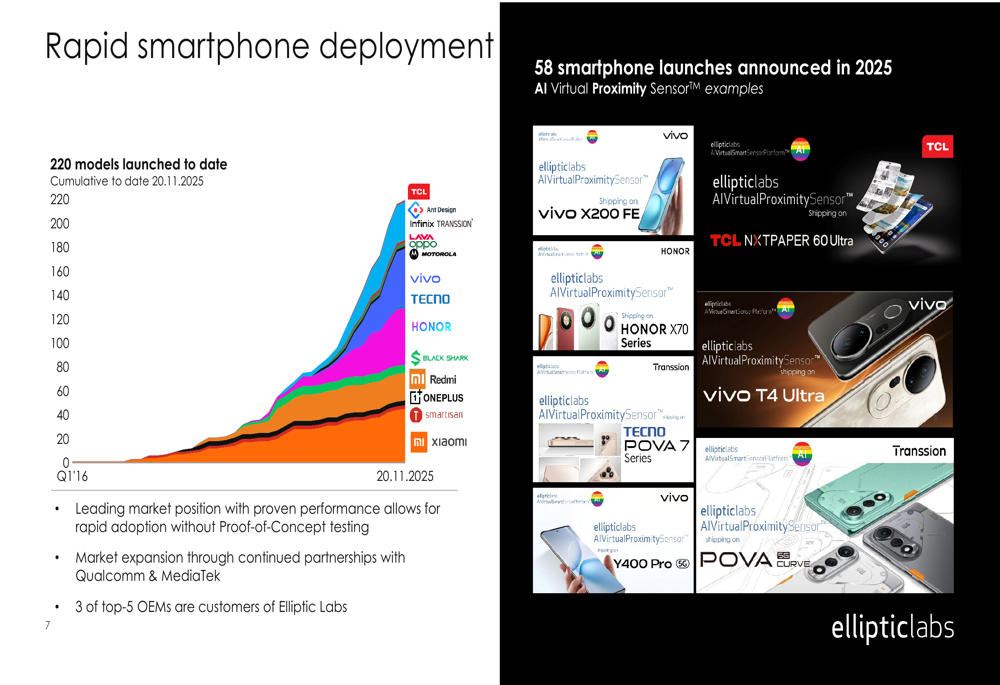 Elliptic Labs has established a strong market position with its AI Virtual Smart Sensors, particularly in the smartphone segment where the company has launched 220 models to date. In 2025 alone, 58 smartphone models featuring the company's technology have been launched, demonstrating accelerating market adoption.