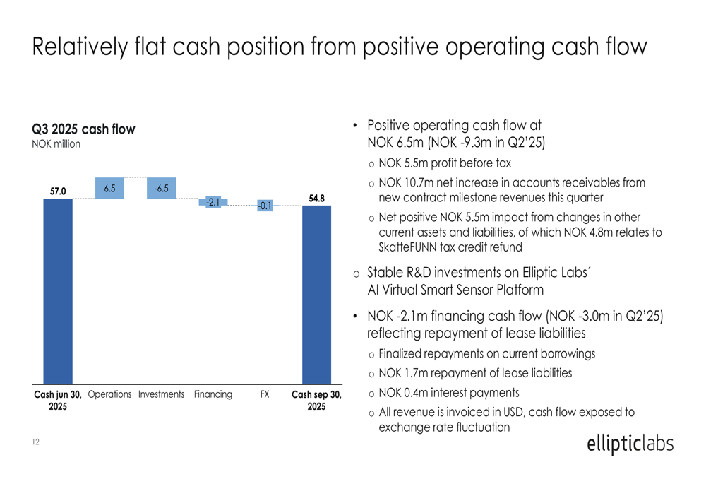 The company reported positive operating cash flow of NOK 6.5 million in Q3 2025, a significant improvement from the negative NOK 9.3 million reported in Q2 2025. This was driven by the NOK 5.5 million profit before tax, partially offset by a NOK 10.7 million net increase in accounts receivables.