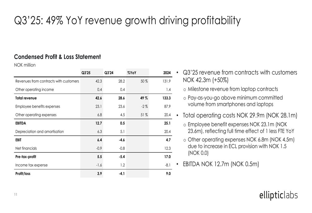 Elliptic Labs reported revenue from customers of NOK 42.3 million in Q3 2025, representing a 50% increase compared to NOK 28.2 million in Q3 2024. This growth was primarily driven by milestone revenue from laptop contracts. The company's EBITDA surged to NOK 12.7 million, a dramatic improvement from NOK 0.5 million in the same period last year.
