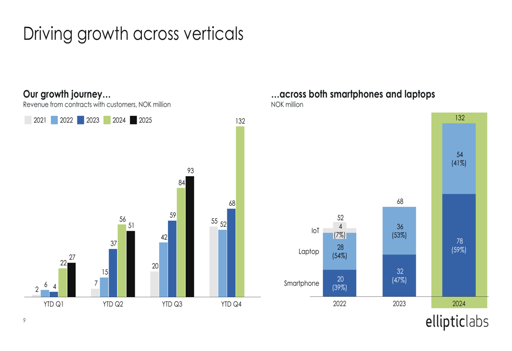 Elliptic Labs has seen growth across both its smartphone and laptop verticals. The company's revenue diversification strategy appears to be yielding results, with both segments contributing to the overall growth trajectory.
