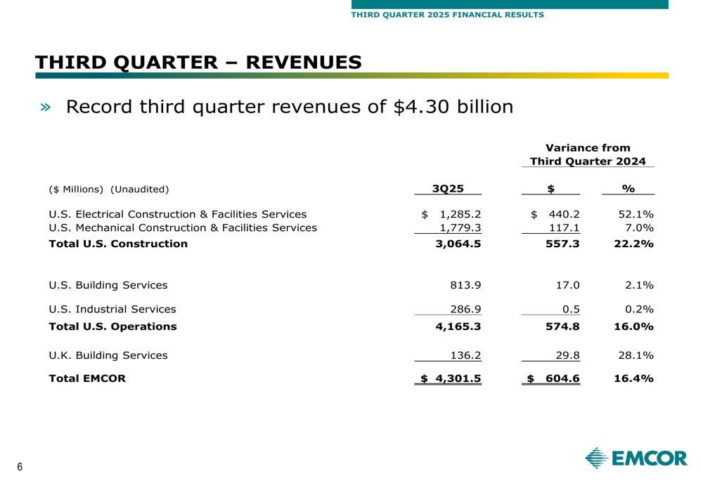 EMCOR delivered impressive financial results for the third quarter of 2025, with revenue reaching $4.30 billion, representing a 16.4% increase compared to $3.70 billion in the same period last year. Operating income grew to $406 million, up 11.6% year-over-year, though operating margin contracted slightly to 9.4% from 9.8% in Q3 2024.