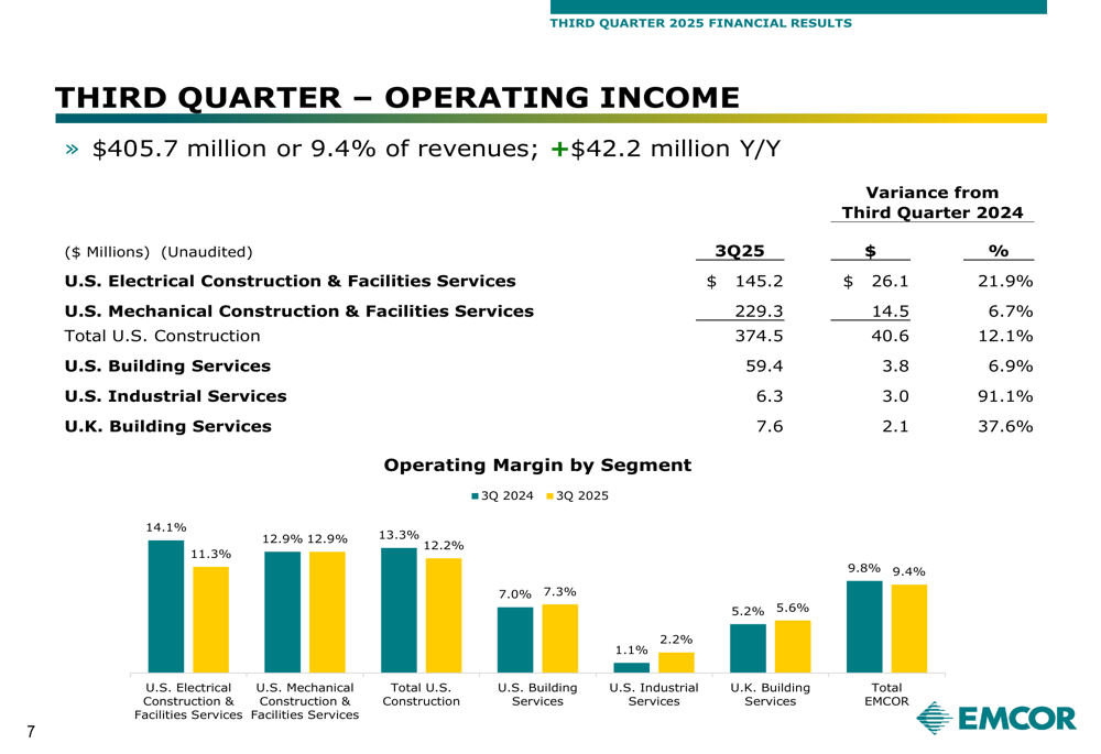 Operating income showed strong performance across segments, with U.S. Industrial Services posting the largest percentage gain at 91.1%, albeit from a smaller base. The company's construction segments continued to drive the majority of profits: