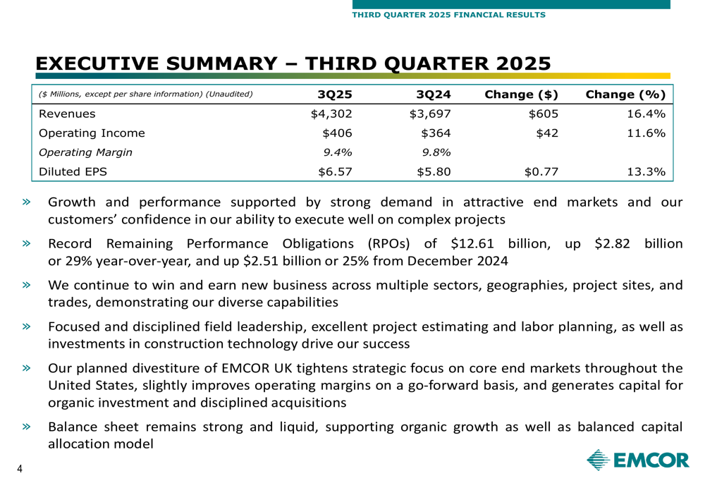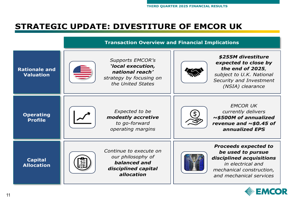 A key strategic announcement in EMCOR's presentation was the planned divestiture of its UK business for $255 million, expected to close by the end of 2025 subject to regulatory approval. The move aligns with the company's "local execution, national reach" strategy, focusing resources on the U.S. market.