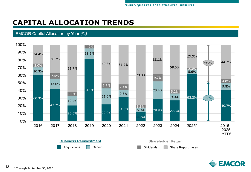 EMCOR's capital allocation strategy continues to balance business reinvestment with shareholder returns, as illustrated in the following chart: