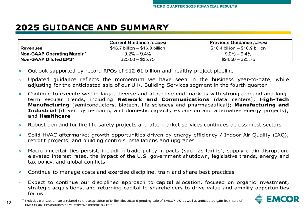 EMCOR narrowed its full-year 2025 guidance, adjusting for the anticipated sale of its UK operations while reflecting strong year-to-date momentum. The company now projects: