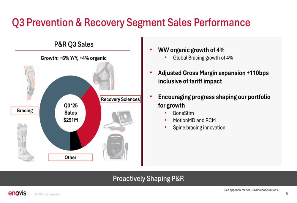 The Prevention & Recovery segment, which focuses on bracing and recovery sciences, grew 6% year-over-year (4% organic). The segment achieved adjusted gross margin expansion of 110 basis points despite tariff impacts, with encouraging progress in portfolio optimization through BoneStim, MotionMD, RCM, and spine bracing innovations.