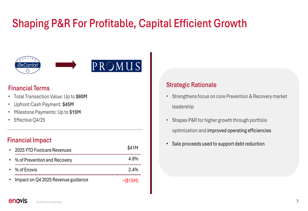 A significant strategic development announced during the quarter is Enovis’s divestiture of its Diabetic Footwear business for up to $60 million, comprising a $45 million upfront payment and potential milestone payments of up to $15 million. The transaction, effective in Q4 2025, involves the sale of a business that generated $41 million in revenue year-to-date, representing 4.8% of the Prevention & Recovery segment and 2.4% of total Enovis revenue.