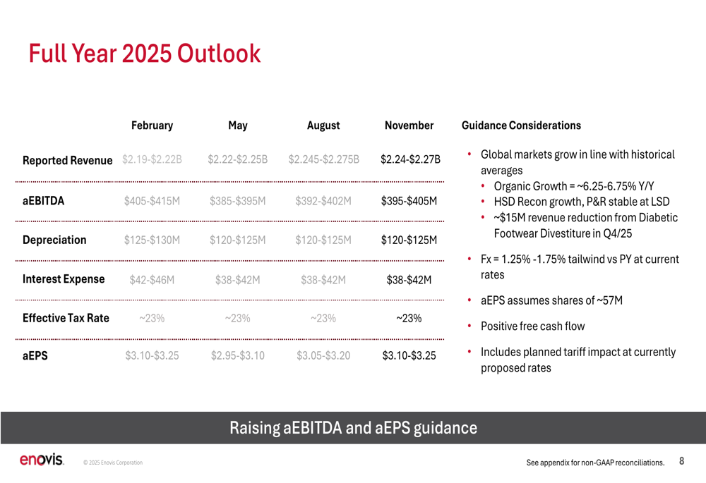Enovis has raised its full-year 2025 guidance for adjusted EBITDA and adjusted EPS, reflecting management’s confidence in the company’s operational performance and growth trajectory. The updated outlook projects: