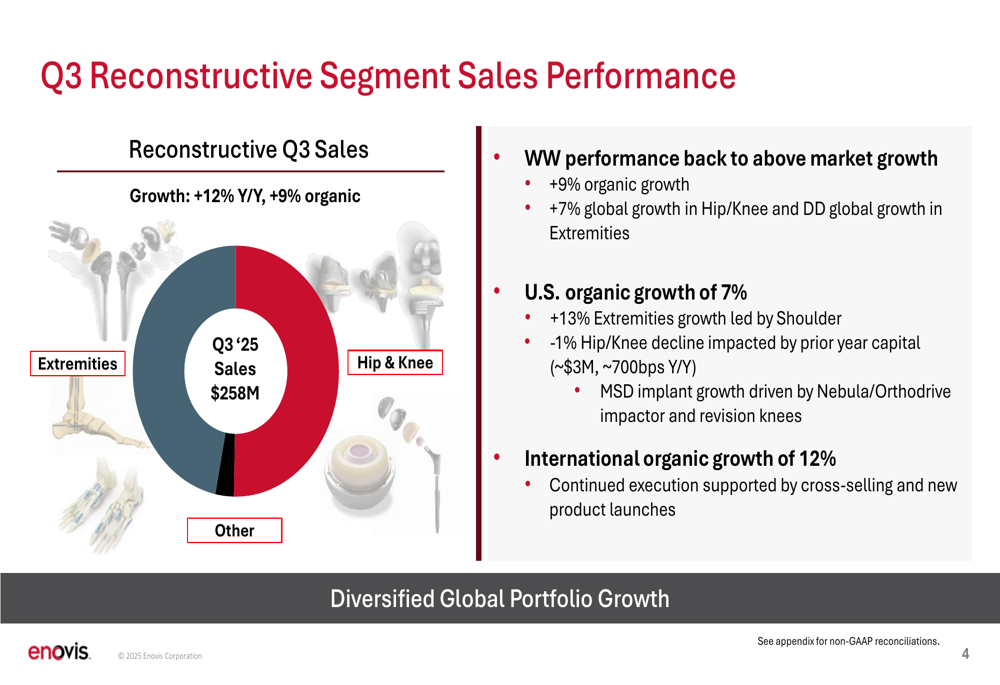 Enovis reported strong organic growth of 7% in the third quarter, with its Reconstructive segment leading the way at 9% organic growth while the Prevention & Recovery (P&R) segment contributed 4% organic growth.