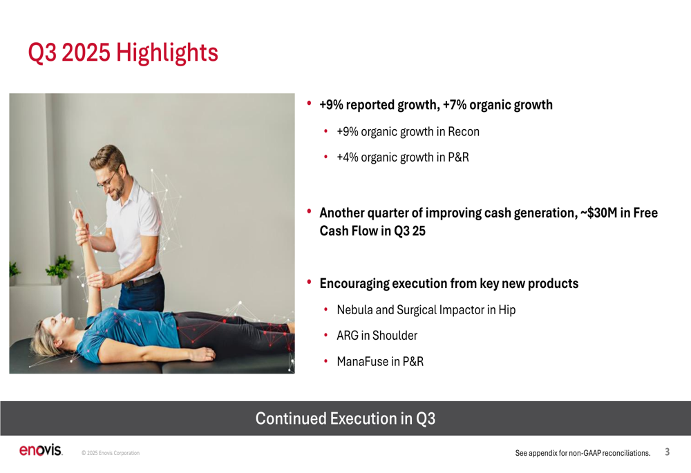 As shown in the following quarterly highlights slide, Enovis also generated approximately $30 million in free cash flow during the quarter, demonstrating improving cash generation capabilities:
