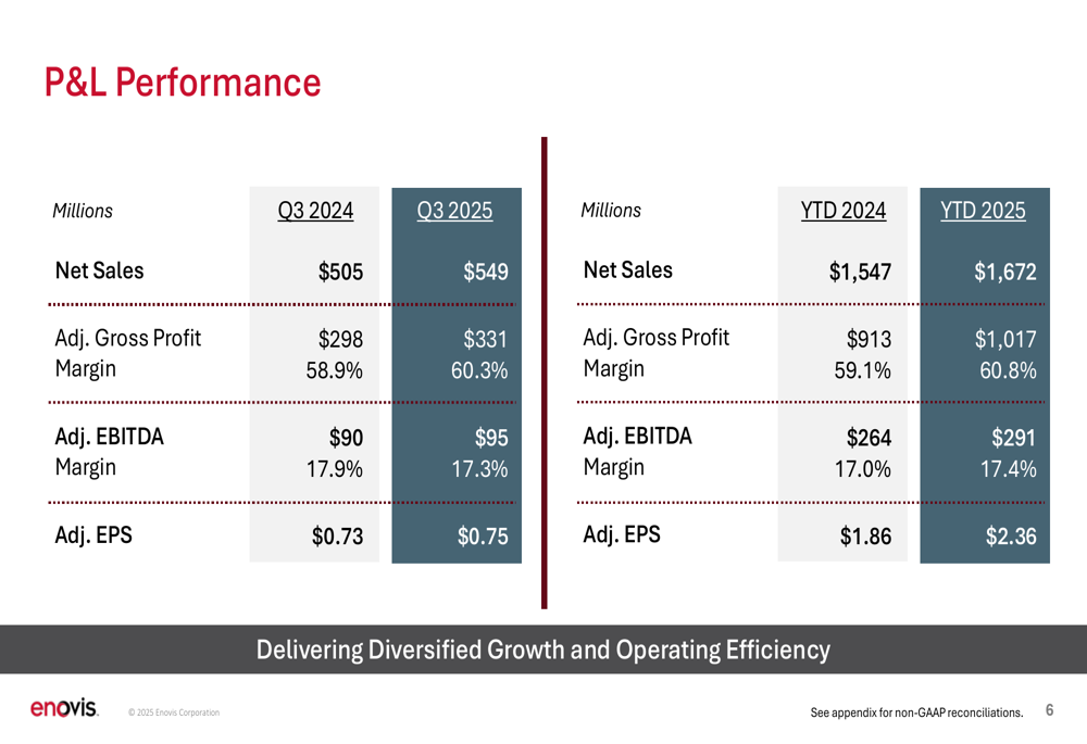 Enovis’s P&L performance shows improvement across several key metrics compared to the prior year. While adjusted EBITDA margin slightly decreased from 17.9% to 17.3% year-over-year for Q3, the year-to-date figure improved from 17.0% to 17.4%.