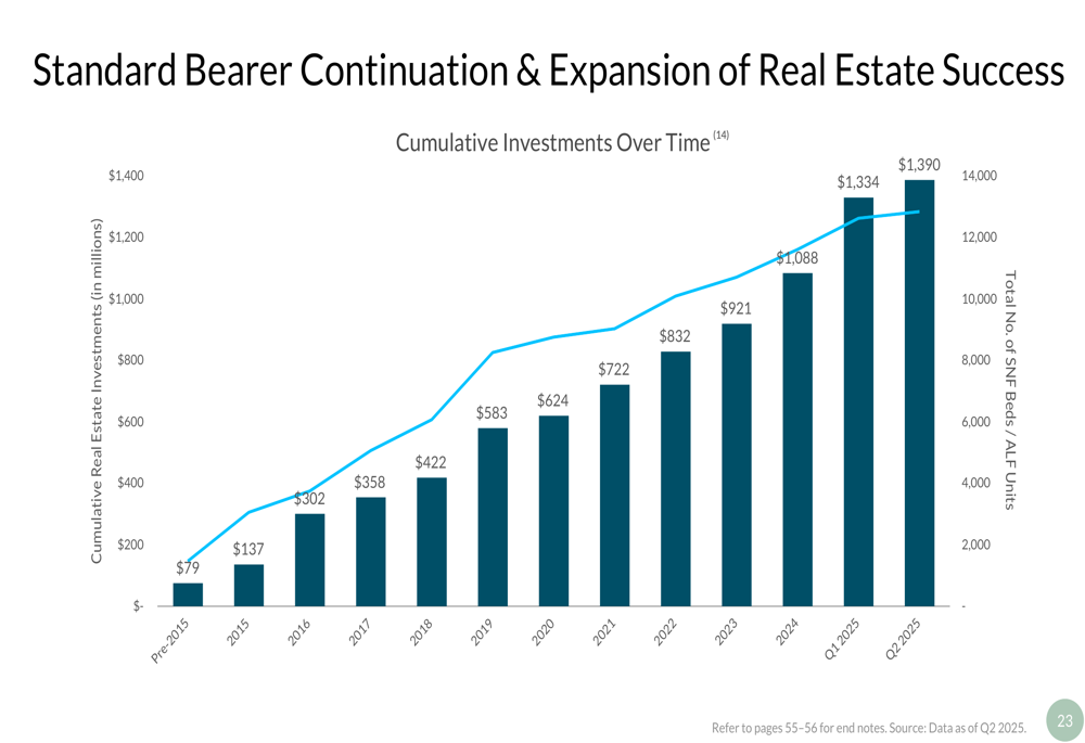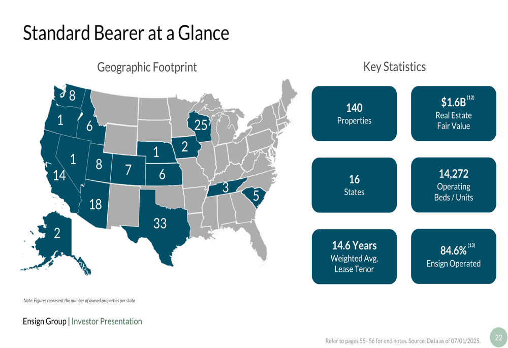 Ensign’s captive REIT, Standard Bearer, represents a significant component of the company’s overall strategy. As of July 2025, Standard Bearer owned 140 properties across 16 states with a real estate fair value of approximately $1.6 billion. The REIT structure provides increased visibility into embedded real estate value, expanded acquisition opportunities, and capital flexibility.