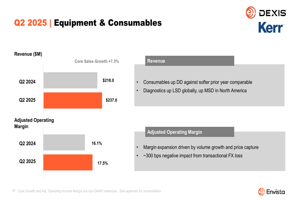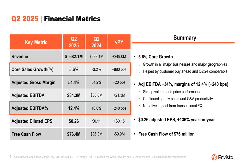 Envista reported Q2 2025 revenue of $682.1 million, representing a $49.0 million increase compared to the same period last year. Core sales growth reached 5.6%, a significant improvement of 880 basis points year-over-year. The company’s profitability metrics showed substantial enhancement, with adjusted EBITDA of $84.3 million, up $21.3 million from Q2 2024, and adjusted EBITDA margin expanding 240 basis points to 12.4%.
