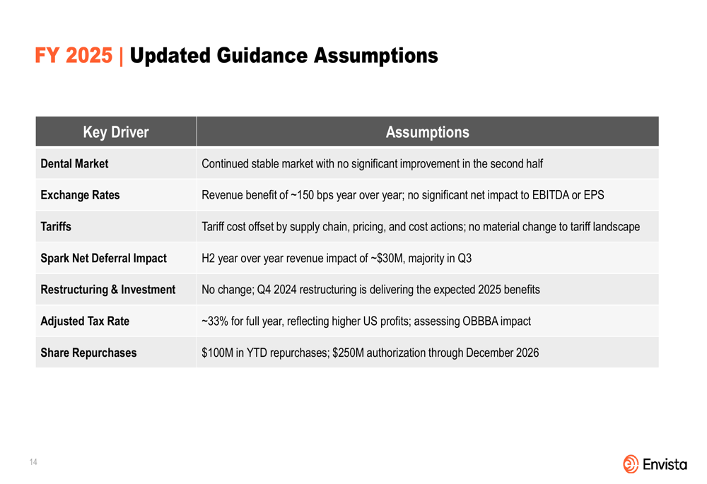 The guidance is based on several key assumptions, including a continued stable dental market, a revenue benefit of approximately 150 basis points year-over-year from exchange rates, and successful offset of tariff costs through supply chain and pricing actions. The company also expects a $30 million impact in the second half from Spark net deferral.