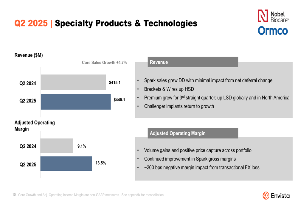 Envista’s two business segments both delivered solid performance in the quarter. The Specialty Products & Technologies segment, which includes the company’s orthodontic and implant businesses, reported revenue of $445.1 million, representing core sales growth of 4.7%. The adjusted operating margin for this segment improved dramatically to 13.5% from 9.1% in the prior year.