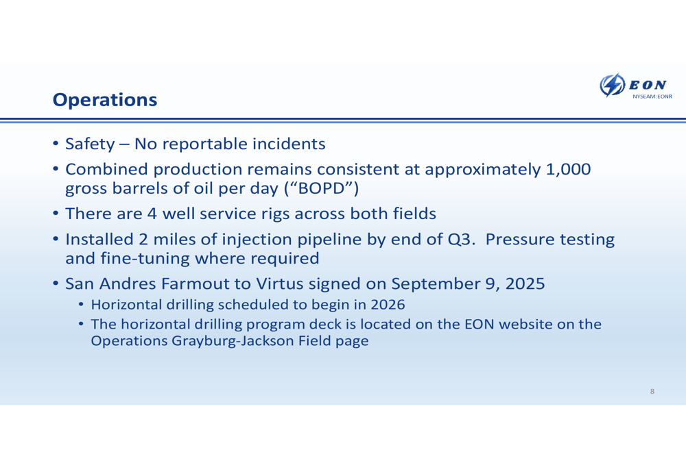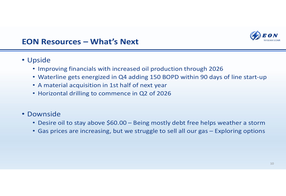EON Resources outlined an optimistic growth trajectory for 2026 and beyond, centered on its horizontal drilling program and potential acquisitions. Management expects improving financials with increased oil production throughout 2026, beginning with an additional 150 BOPD within 90 days of energizing a new waterline in Q4 2025.