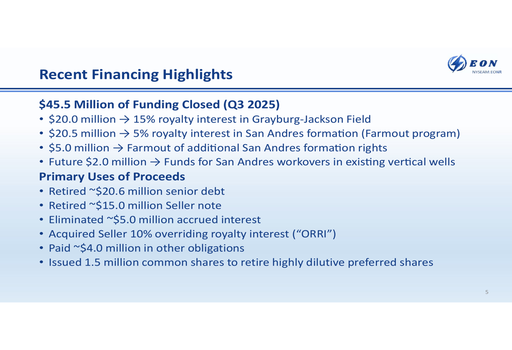 The cornerstone of EON's third quarter was a comprehensive balance sheet restructuring, fueled by $45.5 million in new funding that closed on September 9, 2025. This financing included $40.5 million from a private investor and $5.0 million from Virtus Energy Partners.