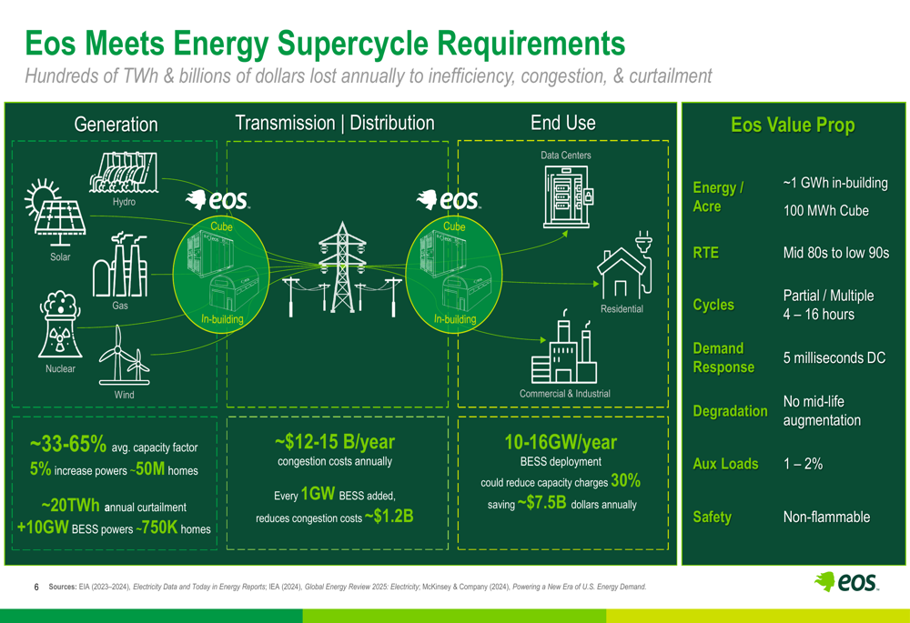 Eos positions its technology as particularly well-suited for the "energy supercycle," highlighting applications across generation, transmission/distribution, and end-use cases. The company emphasized that 65% of its pipeline consists of long-duration storage applications (6+ hours), which aligns with market trends toward longer duration energy storage needs.