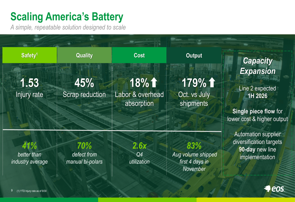 Eos also highlighted operational improvements in its manufacturing processes, including a 45% reduction in scrap, 18% improvement in labor and overhead absorption, and a 179% increase in October shipments versus July. The company reported a safety injury rate of 1.53, which it claims is 41% better than the industry average.