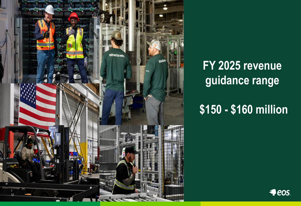 For full-year 2025, Eos provided revenue guidance of $150-$160 million. According to the earnings call transcript, the company anticipates achieving a positive contribution margin in the fourth quarter and a positive gross margin by Q1 2026.