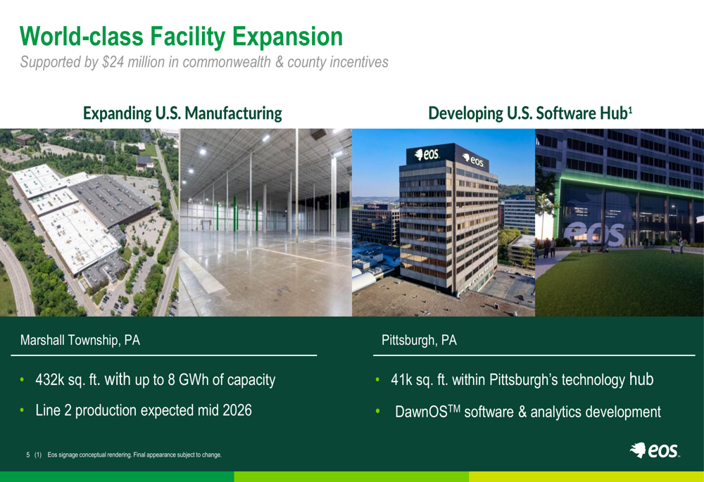 A significant portion of Eos’s presentation focused on its manufacturing expansion strategy. The company is developing a 432,000 square foot facility in Marshall Township, Pennsylvania, with up to 8 GWh of production capacity. Line 2 production is expected by mid-2026. Additionally, Eos is establishing a 41,000 square foot software hub in Pittsburgh for its DawnOST™ software and analytics development.