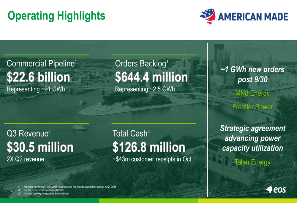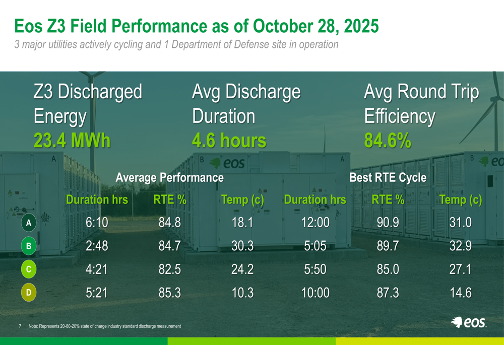 Eos also reported encouraging field performance data for its Z3 energy storage system. As of October 28, 2025, the company had three major utilities actively cycling its technology and one Department of Defense site in operation. Performance metrics showed 23.4 MWh of discharged energy with an average discharge duration of 4.6 hours and average round trip efficiency of 84.6%.
