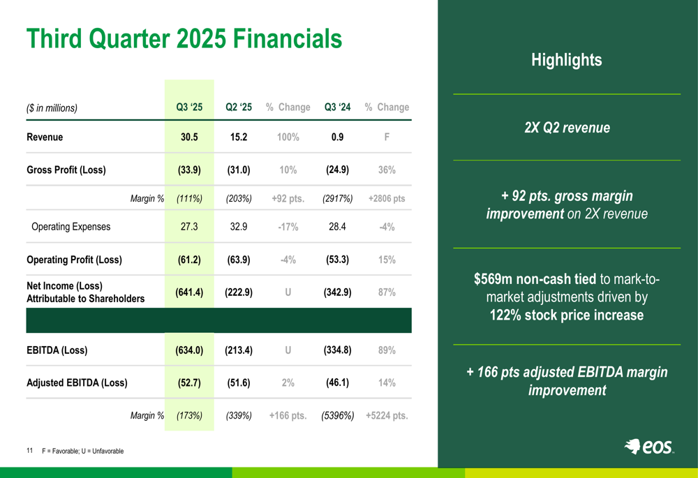 Eos reported Q3 2025 revenue of $30.5 million, representing a 100% increase from the previous quarter’s $15.2 million and a dramatic improvement from just $0.9 million in Q3 2024. This continues a pattern of accelerating quarterly revenue growth throughout 2025.