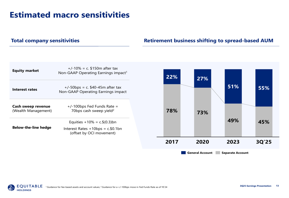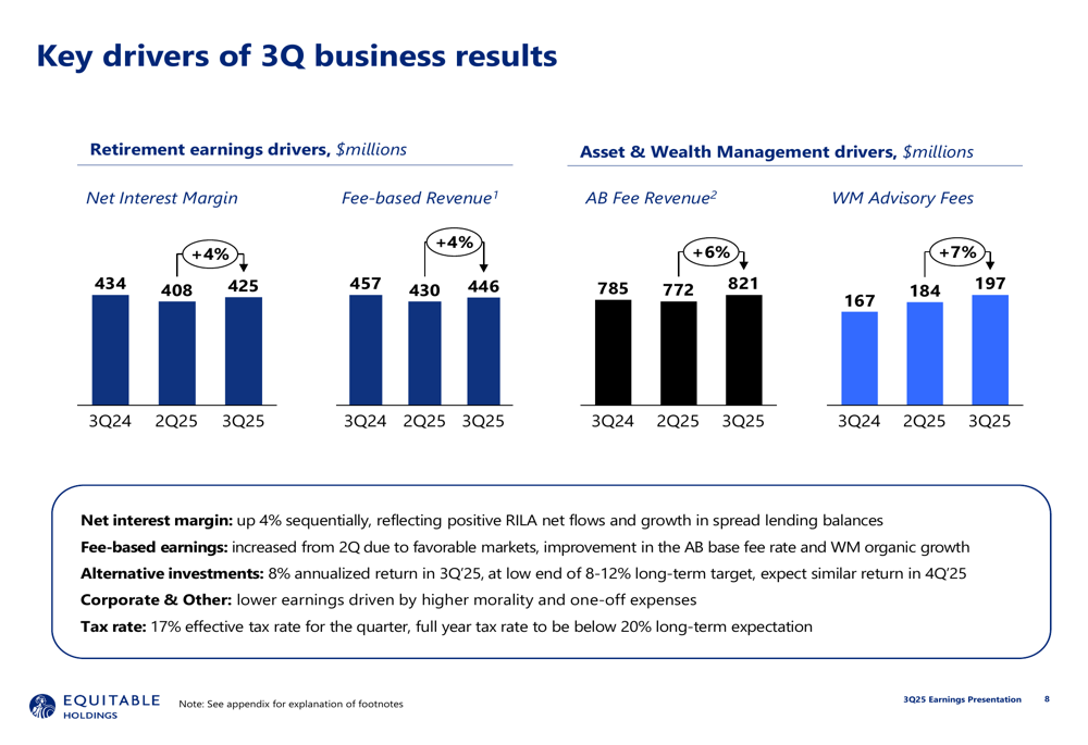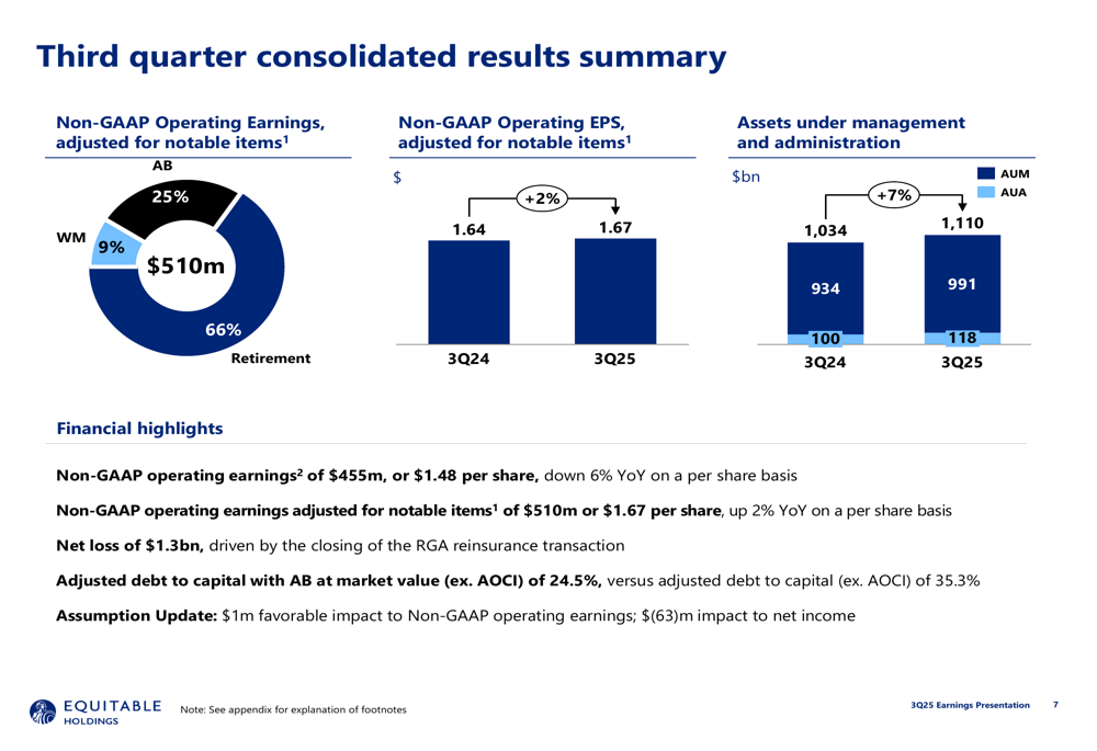 Equitable reported non-GAAP operating earnings of $455 million, or $1.48 per share for Q3 2025. After adjusting for notable items, earnings reached $510 million or $1.67 per share, representing a 2% year-over-year increase on a per share basis. However, the company posted a net loss of $1.3 billion, primarily driven by the closing of the RGA reinsurance transaction.