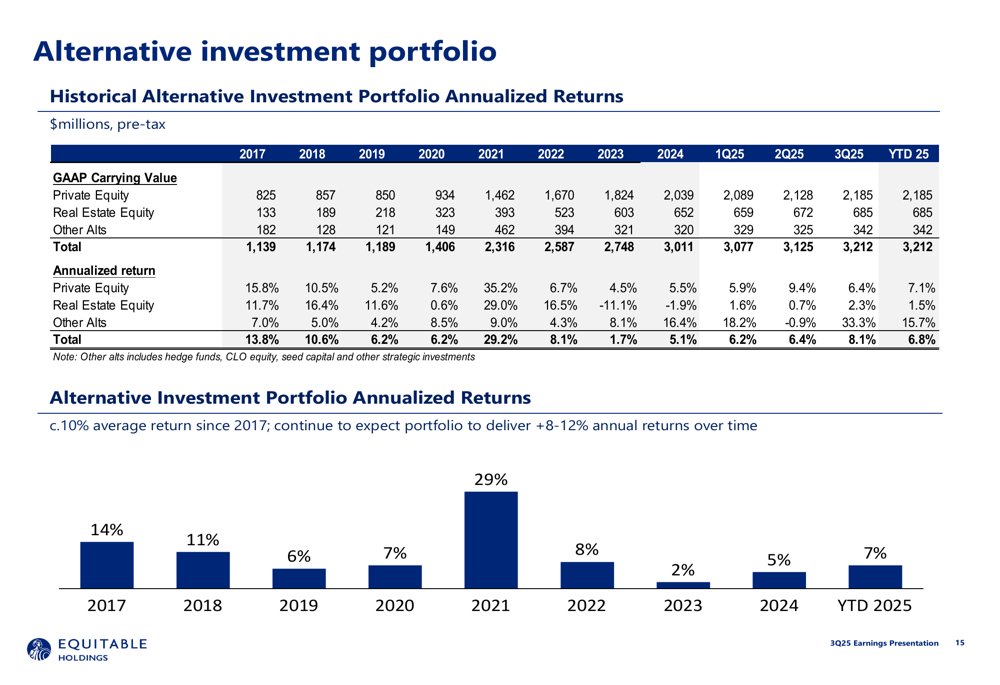 The company's alternative investment portfolio has delivered consistent returns over time, with an average return of approximately 10% since 2017. While the quarterly returns have fluctuated, ranging from 2% in 2023 to 29% in 2021, Equitable expects this portfolio to deliver 8-12% annual returns over the long term. For Q3 2025, alternative investments generated an 8% annualized return, at the low end of the target range.
