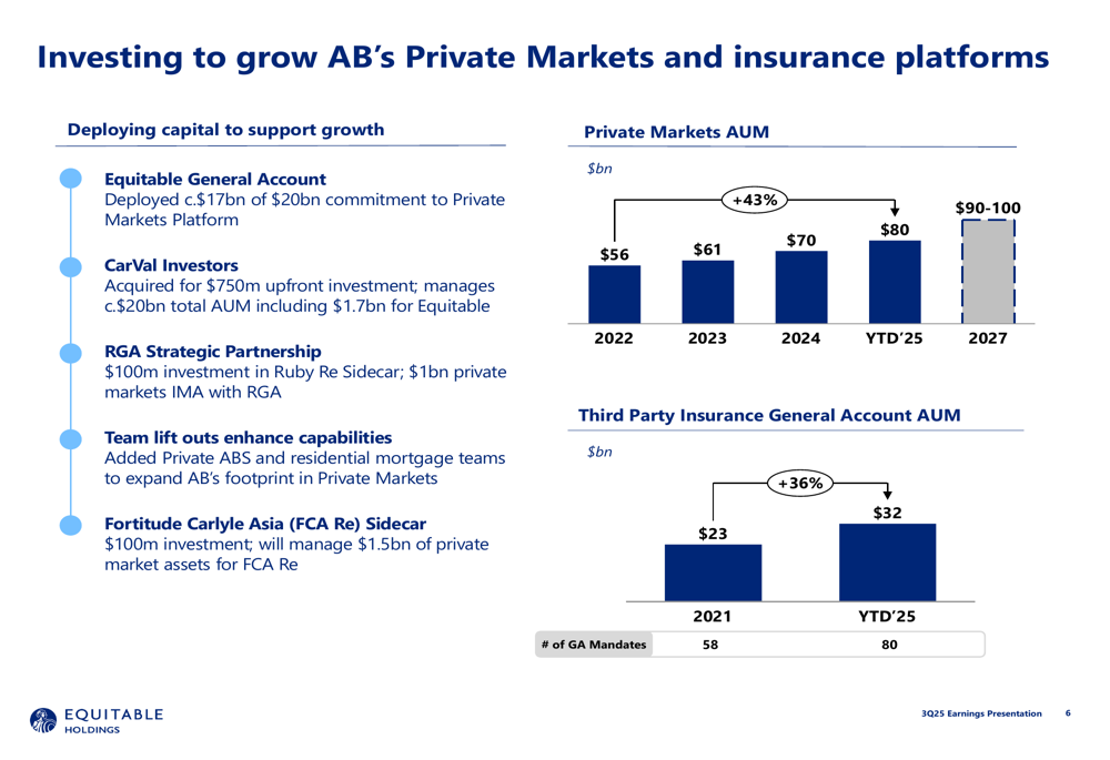 Another key strategic focus area is the expansion of AB's Private Markets and Insurance platforms. Private Markets AUM has grown from $56 billion in 2022 to $80 billion year-to-date in 2025, a 43% increase. The company is targeting $90-100 billion by 2027. Similarly, Third Party Insurance General Account AUM has increased by 36% from 2021 to YTD 2025.