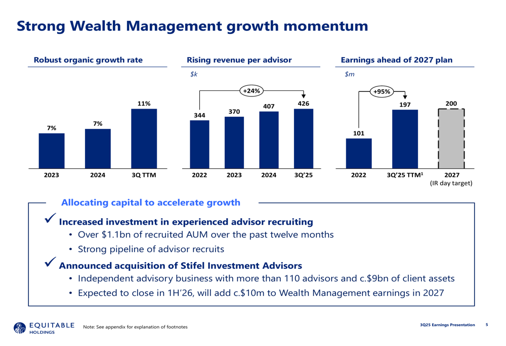 The company's strategic focus on wealth management is evidenced by its announced acquisition of Stifel Independent Advisors, which will add more than 110 advisors and approximately $9 billion in client assets. This acquisition, expected to close in the first half of 2026, aligns with Equitable's strategy to scale adjacent businesses.