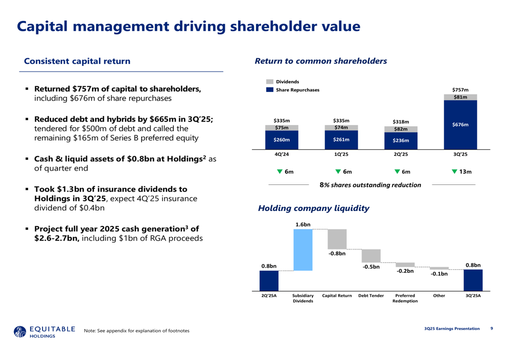 Equitable has been actively managing its capital to enhance shareholder value. In Q3 2025, the company returned $757 million to shareholders, including $676 million in share repurchases. Additionally, Equitable reduced debt and hybrids by $665 million during the quarter. The company projects full-year 2025 cash generation of $2.6-2.7 billion.