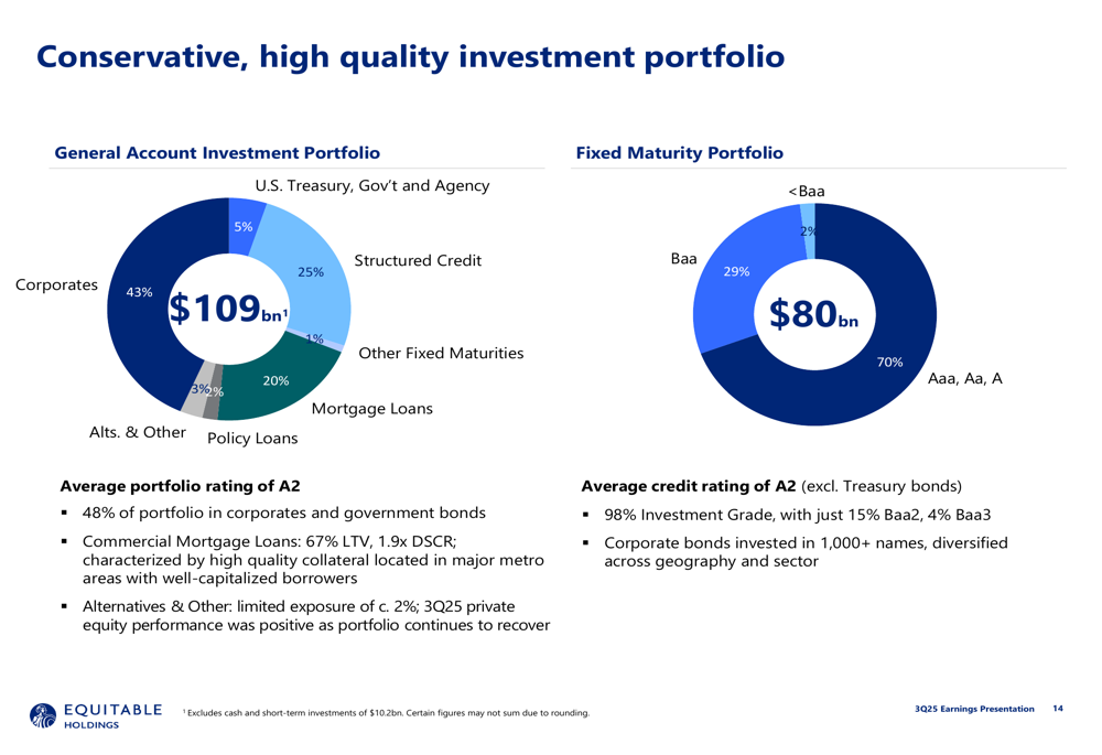 Equitable maintains a conservative, high-quality investment portfolio to support its long-term obligations. The $109 billion General Account Investment Portfolio is primarily allocated to corporate bonds (43%), structured credit (25%), and other fixed maturities (20%). The fixed maturity portfolio, valued at $80 billion, is predominantly invested in high-quality securities, with 70% rated Aaa, Aa, or A, and an average portfolio rating of A2.