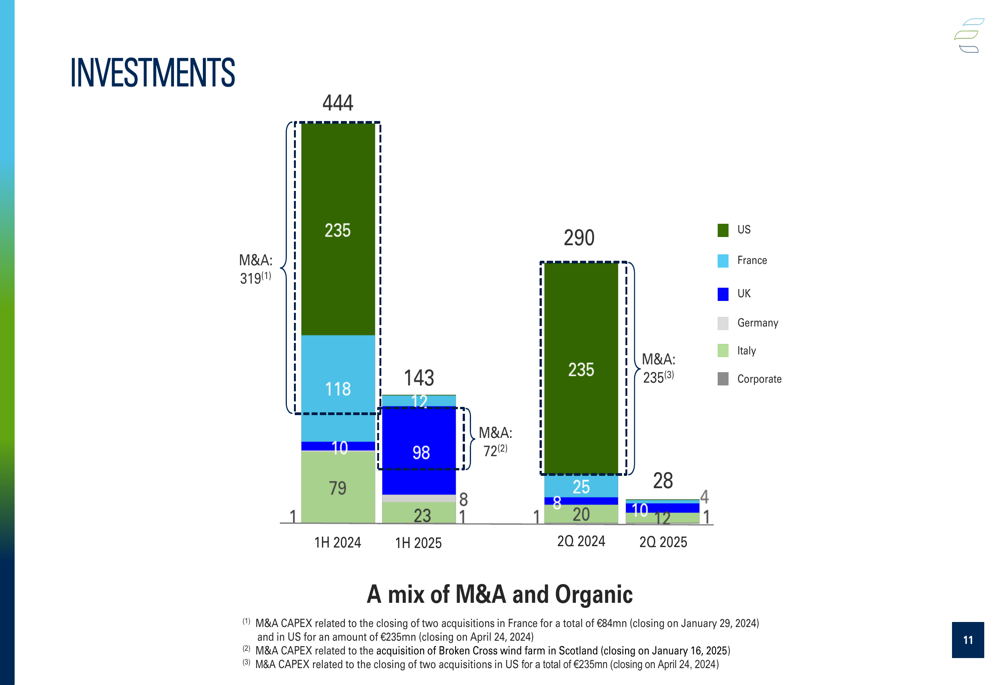 ERG's investment strategy continued to be aggressive, with total investments (CAPEX and M&A) of €364 million in the first half of 2025, compared to €444 million in the same period of 2024. The second quarter saw a significant increase in investments to €290 million from €143 million in Q2 2024, indicating an acceleration of the company's growth initiatives.