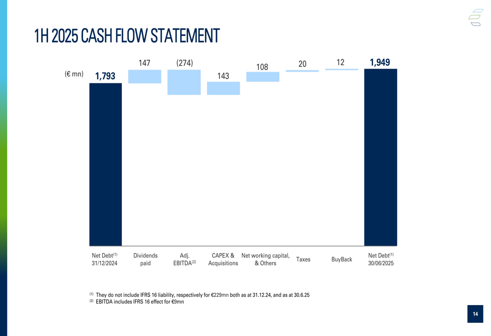 As shown in the following financial highlights chart, first half results were more mixed, with EBITDA declining slightly to €274 million from €281 million in 1H 2024, while net profit decreased more substantially to €83 million from €106 million: