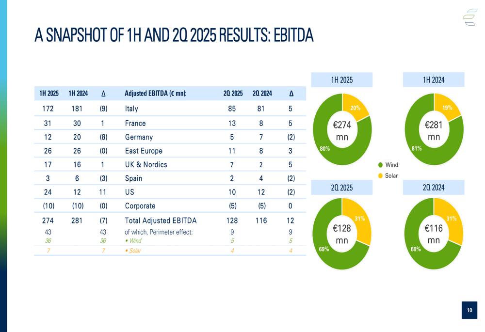 ERG attributed its ability to maintain production levels to the contribution of new assets, which helped offset the impact of poor wind generation. This is reflected in the EBITDA breakdown by technology and region: