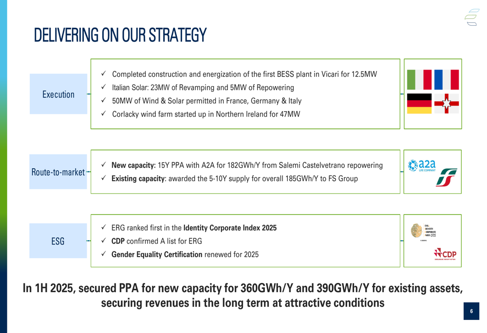 A significant focus of ERG's strategy has been securing long-term revenue streams through power purchase agreements. In the first half of 2025, the company secured PPAs for new capacity totaling 360GWh per year and for existing assets totaling 390GWh per year. Notable agreements included a 15-year PPA with A2A for 182GWh per year from the Salemi Castelvetrano repowering project, and a 5-10 year supply agreement with FS Group for 185GWh per year.