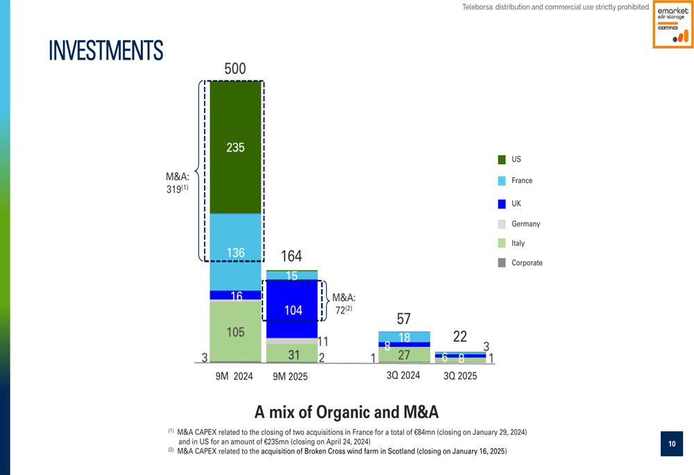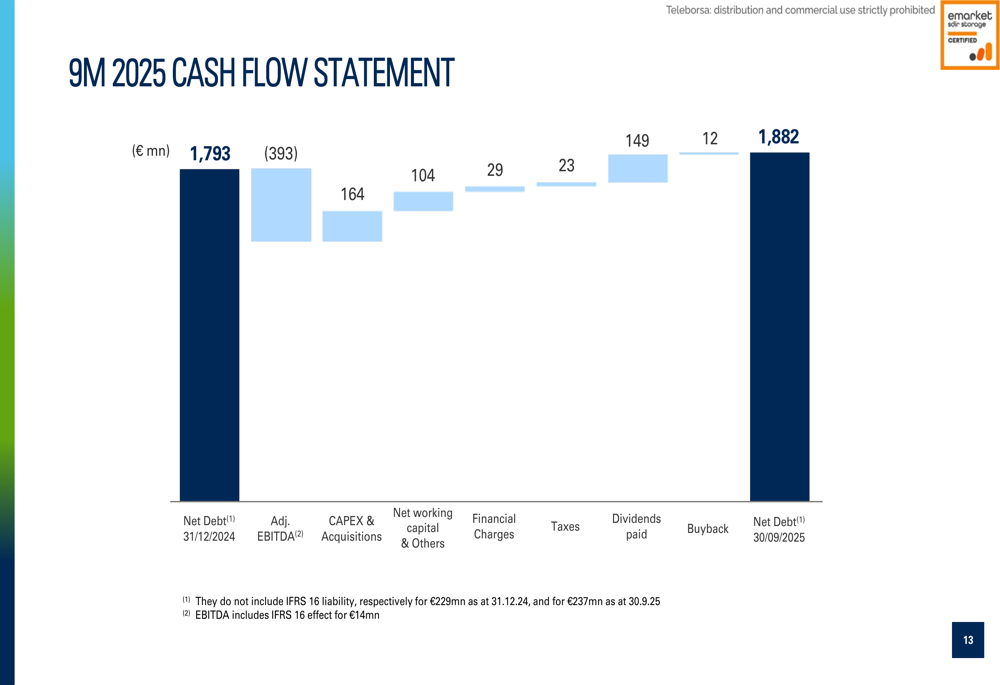 Investment activity has moderated compared to the previous year, with CAPEX of €22 million in Q3 2025 versus €31 million in Q3 2024. For the nine-month period, total investments including M&A reached €164 million, significantly lower than the €392 million spent in the same period of 2024.