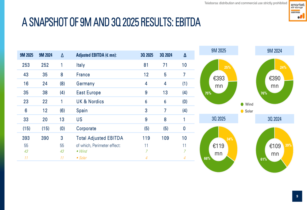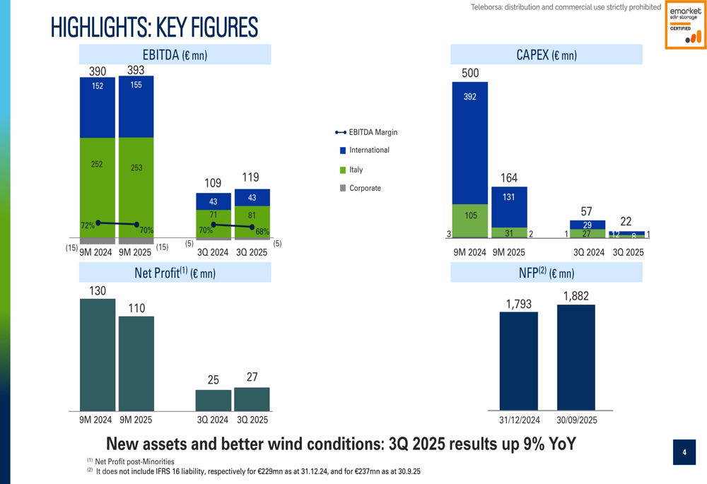 ERG's third-quarter results showed solid improvement over the same period last year. EBITDA reached €119 million, up 9% from €109 million in Q3 2024, while adjusted net profit grew to €27 million from €25 million in the prior year period.